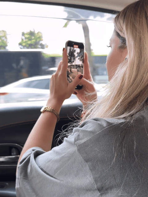 在出租车前往景点的路上,她兴奋的看着周边的建筑。